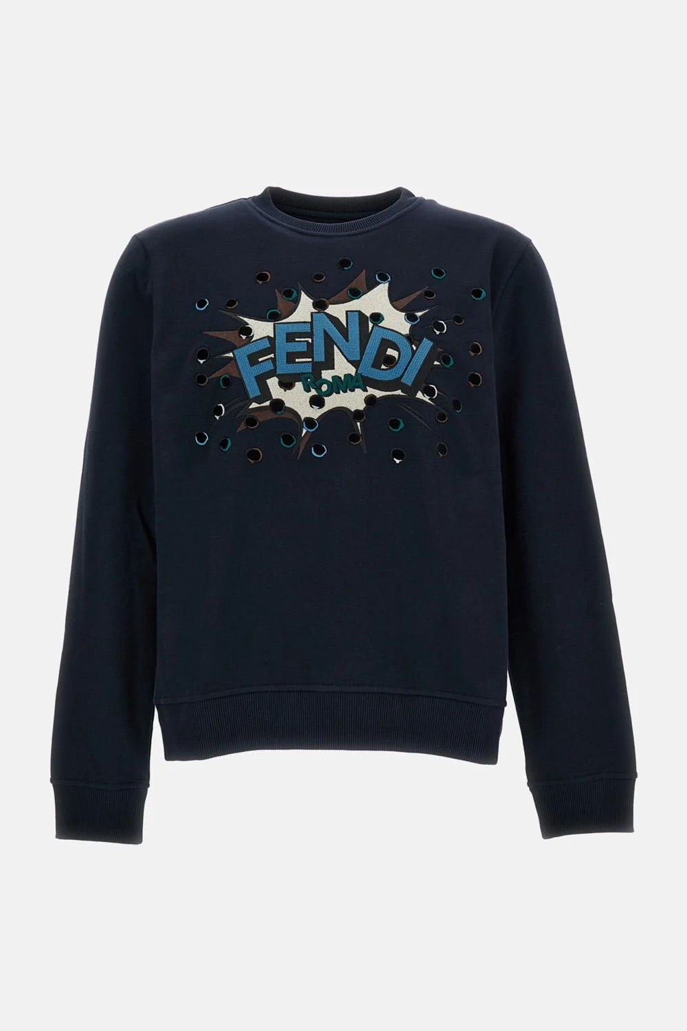 Long-sleeved sweatshirt with round neckline. Regular fit. Crafted from 100% dark blue cotton. Embellished with a contrasting embroidered Fendi Boompop motif on the front, featuring details inspired by the Falena Dots pattern from the collection. Made in Italy Details and Care Color: Blu Composition: 100% CO Made in: Italia Sku: FY0178AW0YF0QG0
