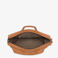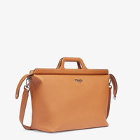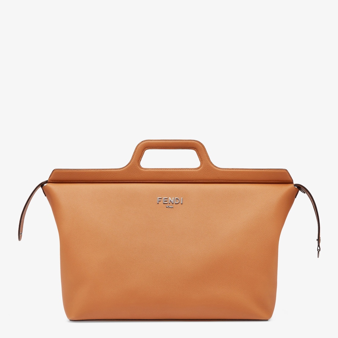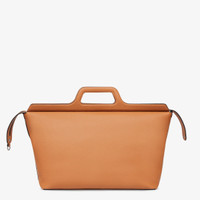 Duffle bag made of tan-colored full-grain leather. Fendi Roma logo in metal. The model can be folded up for easy transport within a suitcase. Inner compartment with zipper, microfiber lining, inner zipper pocket, and brushed ultra-black ruthenium finish metalware. Featuring stiff handles and removable leather shoulder strap. Made in Italy Composition: 100% calf leather, inside: 100% calf leather, 63% cotton, 34% polyester, 3% acrylic Model height: null Size worn: null Measurements: - Height : 30 cm - Depth : 17 cm - Width : 39 cm Product Code: 7VA586ALA8F1KAM