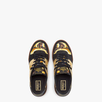 Versace by Fendi Fendi Match compact design sneakers with vintage label on tongue. Branded with FF pattern sewn on the side and embossed Fendi lettering on the sole. Made of black suede with gold metallic leather details. Embellished with nylon inserts with graphic design that combines the iconic Fendi FF logo with the Versace Baroque motif in black and gold. Black terry collar and laces. Covered rubber cupsole with brown bumper. Made in Italy Composition: 100% Calfskin, 100% Polyamide, interior: 69% Polyester, 28% Polyamide, 3% Elastane Product Code: 7E1538AJYXF1HG0