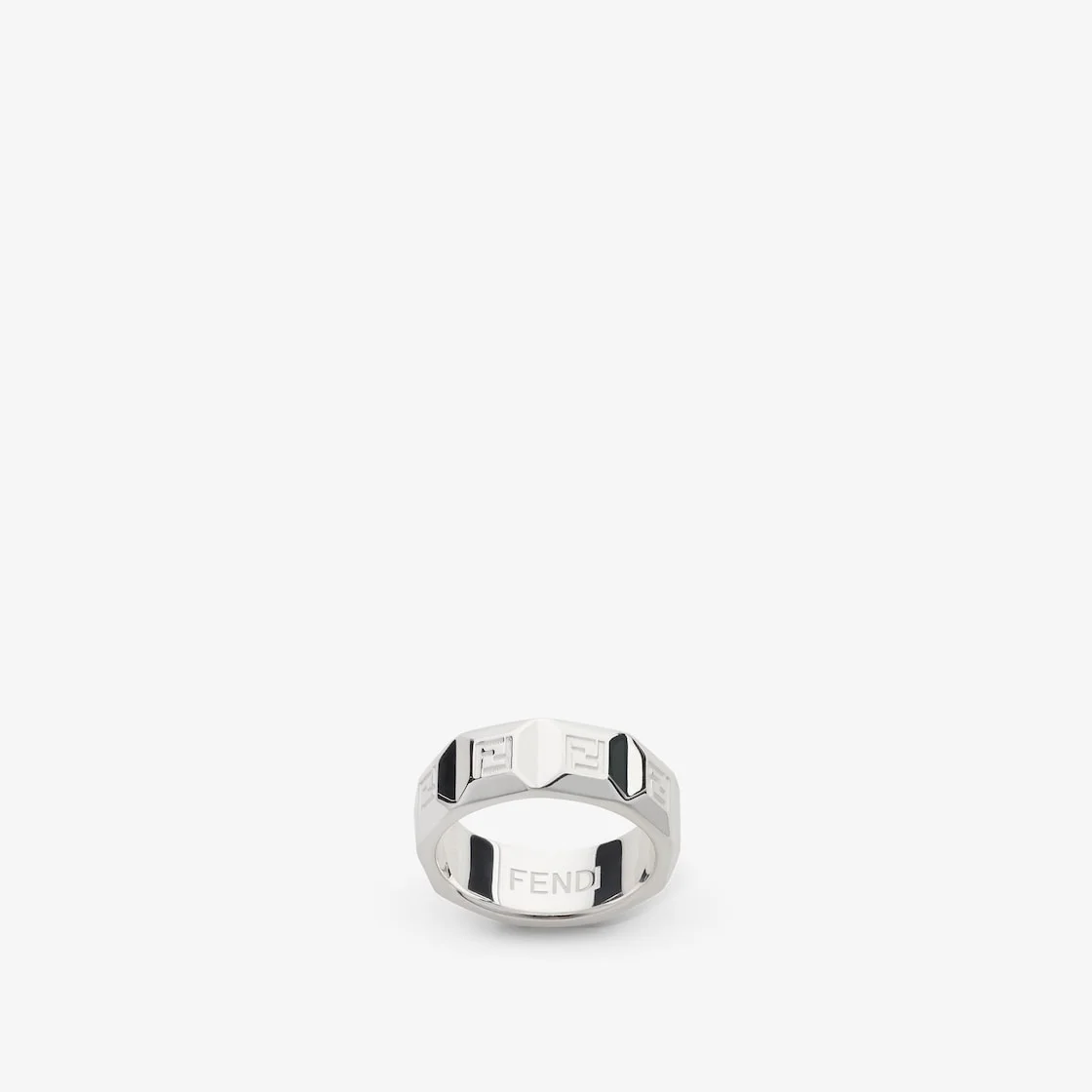 Wide-band ring made of sterling 925 for an extraordinary style statement. Part of the new Fendi 925 men’s fashion jewelry line, inspired by the shapes of precious stones. The ring features a distinctive and exclusive square-shaped design with engraved Fendi and FF motif. Made in Italy Composition: main material: 100% silver-12g Product Code: 7AJ995AV8KF1TR9 Product Care: Keep the product away from perfumes, cosmetics and solvents, sea water and chlorinated water. Store the product in a separate, cool and dry place. Silver naturally tends to tarnish over time. If this happens, feel free to contact the Fendi Client Service or our boutique staff in person.