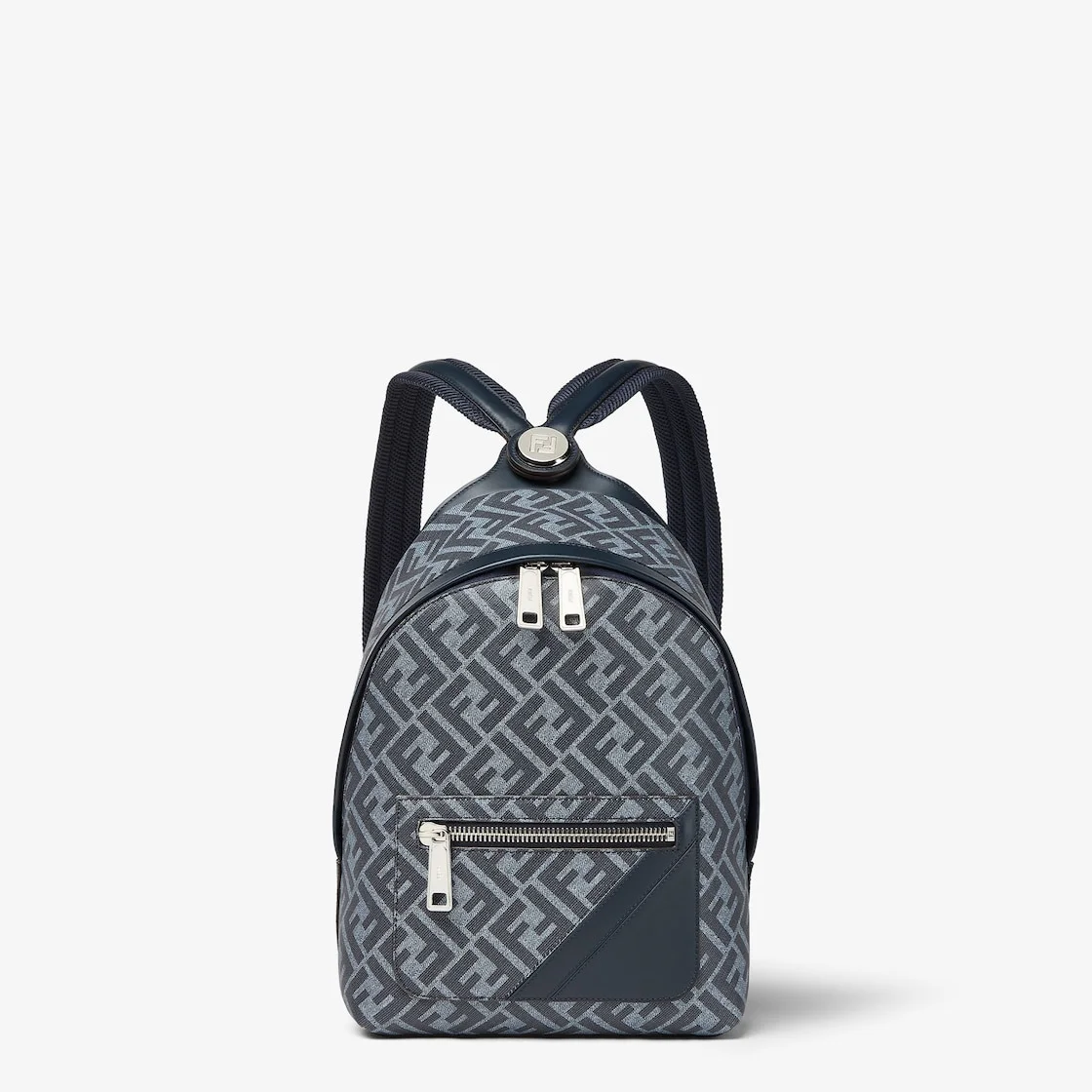 Small structured backpack. The design features a metal rivet with an engraved FF logo that joins the shoulder straps and allows it to be worn as a one-shoulder style. Made of denim blue FF canvas and dark blue leather, with a dark blue leather diagonal insert on the pocket and front zipper. Features a compartment with a zipper closure with a double slider, internal zipper pocket and palladium-finish metalware. Made in Italy Composition: 49% polyurethane, 28% cotton, 23% polyester, 100% calf leather Product Code: 7VZ077ASICF1O97