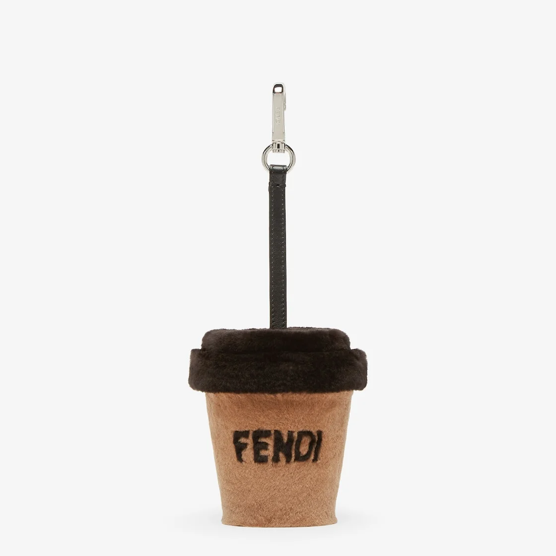 Cup-shaped charm. Inside split keychain ring, usable as key ring. Ring and logo clip. Made of beige mink with brown Fendi lettering inlay. Brown mink lid and black leather details. Palladium-finish metalware. Made in Italy Composition: 100% mink fur, 100% calf leather Product Code: 7AP086ASIGF013C