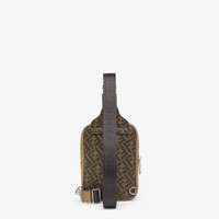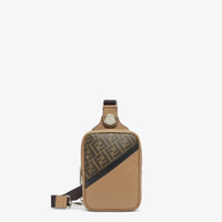 Rectangular belt bag made of brown FF canvas and beige leather, with a black leather diagonal insert. The design is distinguished by the metal rivet with an engraved FF logo that allows the strap to be rotated. Features a front pocket, compartment with a zip fastening, zip pocket and palladium-finish metalware. Completed with an adjustable technical fabric shoulder strap embellished with the FENDI lettering, with clip to wear the bag on the right or left shoulder. Made in Italy Composition: 49% polyurethane, 28% cotton, 23% polyester, 100% calf leather, interior: 63% cotton, 34% polyester, 3% acrylic Product Code: 7VZ085ARMDF1EGA