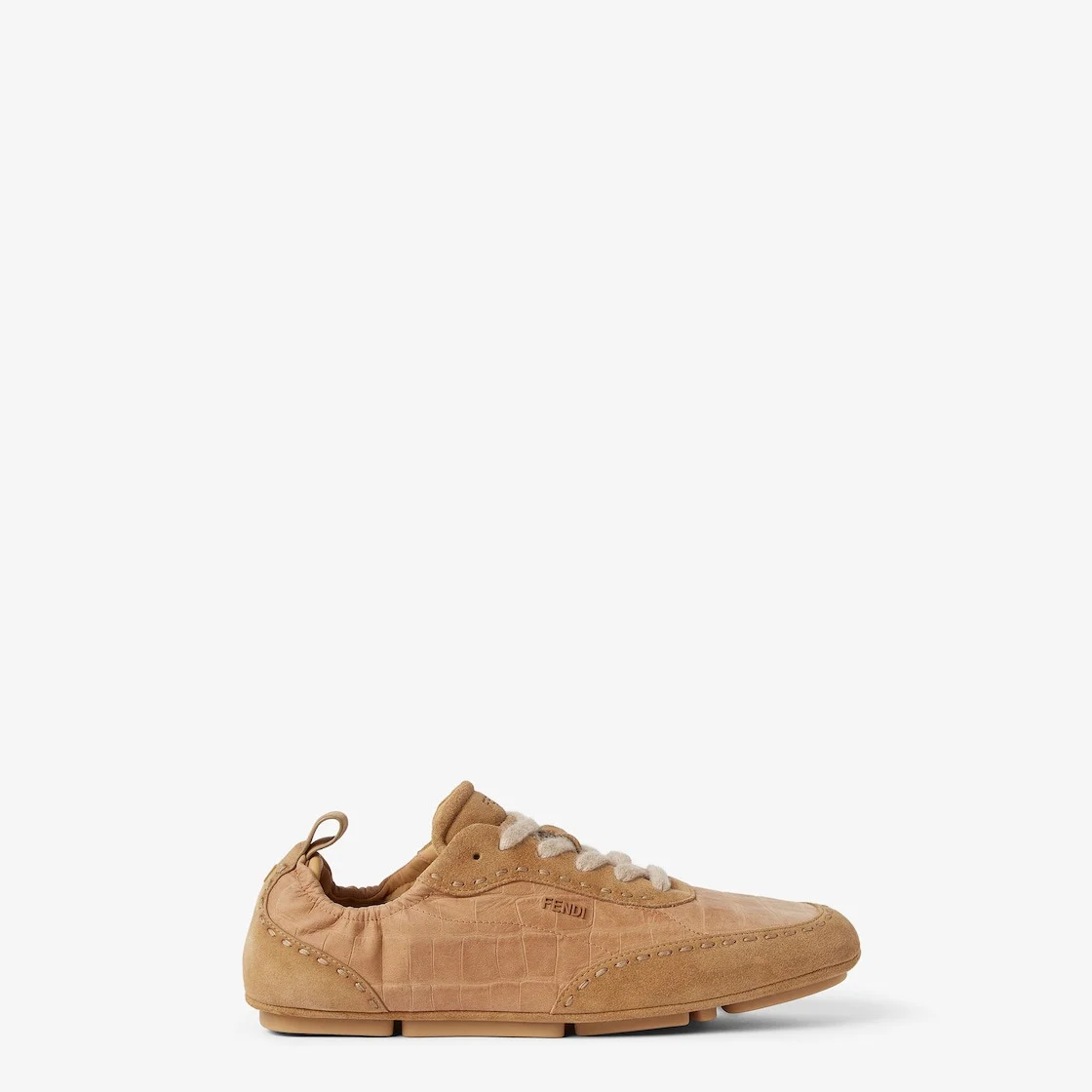 Fendi Fit lace-up low-tops. Made of beige crocodile print calf leather with suede details. Finished with hand-sewn tone-on-tone macro topstitches, an emblem of the iconic Selleria workmanship handed down through generations of Fendi artisans since 1925. The flexible pouch construction with elastic insert and heel padding guarantees a comfortable fit. Finished with 3D Fendi logo on the side. Rubber injection sole featuring Fendi motif. Made in Italy Composition: 100% calf leather, inside: 100% calf leather Product Code: 7E1799AUHKF1T26