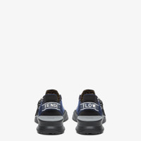 Slip-on sneakers with elastic laces, side zipper and corrugated sole with engraved F. Fendi Flow lettering embossed on the heels. Made of navy blue FF Lycra®. Dark blue suede and leather details. Embellished with a brown FF Lycra® tongue. Black rubber soles with gray diagonal F detail. Made in Italy Composition: 38% polyamide, 37% polyester, 25% elastane, 100% calf leather, inside: 100% recycled polyester Product Code: 7E1392AQ6DF1R76