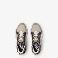 Slip-on sneakers with elastic laces, side zipper and corrugated sole with engraved F. Fendi Flow lettering embossed on the heels. Made from beige nubuck leather with hot stamped FF motif and khaki suede details. Embellished with a Lycra® tongue with FF motif. Sole in lightweight white rubber with diagonal F detail. Made in Italy Composition: 100% calf leather, inside: 100% polyester Product Code: 7E1766AU2OF1SVP