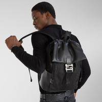 Fendi Flux backpack made of black padded FF nylon, with a luxurious and lightly embossed texture. Flap in smooth black calf leather, embellished with a metal FF clasp buckle closure. Large fabric-lined internal compartment with 13” laptop compartment, zipped pocket and drawstring closure, with customized cords and details details. Brushed ruthenium-finish metalware. Adjustable, padded black webbing and leather handle and straps. Large main compartment designed to hold a 13-inch laptop or tablet and everyday items. Made in Italy Composition: 100% polyamide, 100% calf leather, inside: 63% cotton, 34% polyester, 3% acrylic Product Code: 7VZ090AVC6F0SAJ