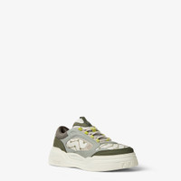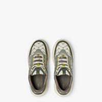 Fendi Force lace-up low-tops. Made of white full-grain leather and gray and dark green nubuck. Embroidery on the upper, finished with hand-sewn contrasting macro Selleria topstitches, an emblem of the iconic Selleria workmanship handed down through generations of Fendi artisans since 1925. Details in green and acid green technical fabric. Lightweight, chunky white soles with FF motif detail on the toe and heel. Made in Italy Composition: 100% calf leather, 100% polyester, inside: 100% polyester, 100% lamb leather Product Code: 7E1728AU21F1RSW