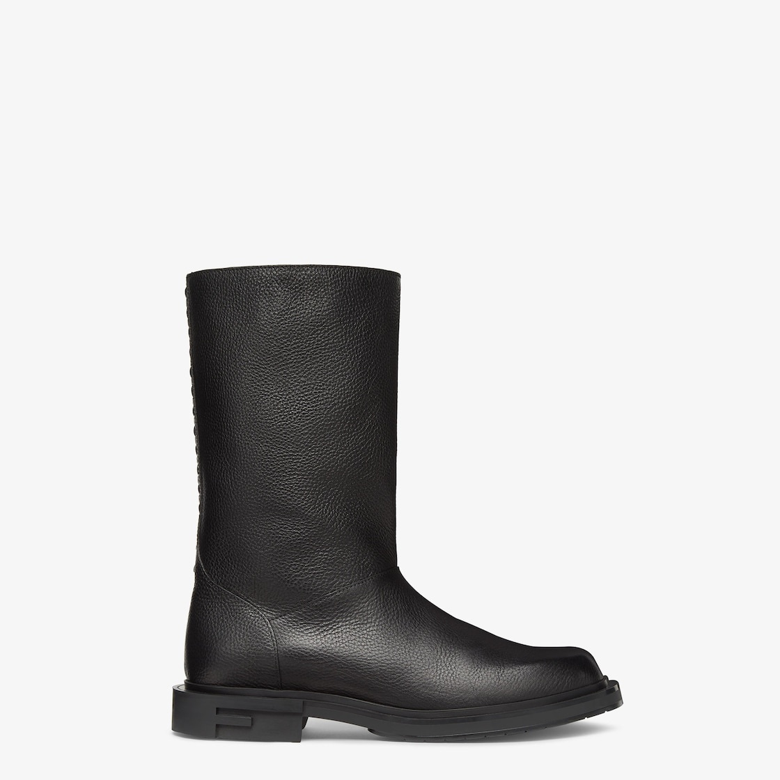 Fendi Frame boots with rounded toe and tubular leg. Made of black full-grain leather. Rubber sole with F detail engraved on the side. Finished with tone-on-tone hand stitching on the back. Made in Italy Composition: 100% calf leather, interior: 100% calf leather Product Code: 7U1678TDKF0QA1
