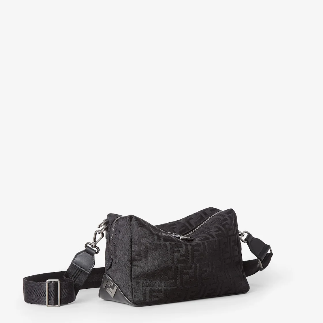 Medium Fendi Lui bag with a soft design, made of black padded FF nylon with a shiny and lightly embossed texture and black smooth calf leather. Decorated with a long zip fastening with double slider and FF metal appliques on the corners. Interior compartment with fabric lining, internal flat pocket and metalware with brushed ruthenium finish. The bag can be carried by hand, on the shoulder or cross-body thanks to the removable leather handle and adjustable, detachable webbing shoulder strap. Made in Italy Composition: 100% polyamide, 100% calf leather, inside: 63% cotton, 34% polyester, 3% acrylic Product Code: 7VA672AVC6F0SAJ