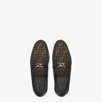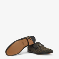 Streamlined loafers and strap decorated with Fendi O'Lock detail. Made of Eclissi FF jacquard, shaded by hand on the border in brown. Lightweight, flexible leather soles with F-shaped grip detail in rubber on the heel. Palladium-finish metalware. Made in Italy Composition: 50% polyester, 50% polyamide, 100% resin, 100% calf leather, inside: 100% calf leather Product Code: 7D1690AORTF1LQB