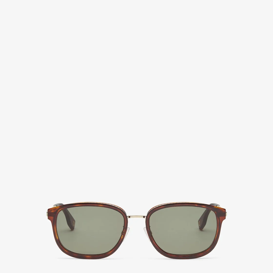 Round Travel glasses with gold-colored metal and dark Havana acetate frame. The front features a metal and acetate combo, distinguished by an engraved FF pattern on the side. Slender, gold-colored metal temples and dark Havana acetate tips. Adjustable nose pads branded with the Fendi logo. Green lenses. Made in Italy Composition: 100% plastic Product Code: FOL573V1PF1RW5 Product Care: Wash your eyeglasses every day with warm water and a pH-neutral soap.Do not use alcohol, aggressive chemical products or disinfectant wipes and do not dry them with paper or other cloths that could scratch them or leave streaks.Dry with a clean microfiber cloth.After use, always keep your eyeglasses in their case.