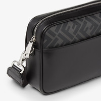 Compact shoulder bag made of black shiny leather and black FF Canvas. Decorated with FF metal applique. Featuring a flat outer pocket and zip compartment. Lined interior and palladium-finish metalware. Adjustable and detachable technical fabric cross-body shoulder strap with FENDI lettering. Made in Italy Composition: 100% calf leather, 49% polyurethane, 28% cotton, 23% polyester, inside: 63% cotton, 34% polyester, 3% acrylic Product Code: 7M0286AJF0F0GXN