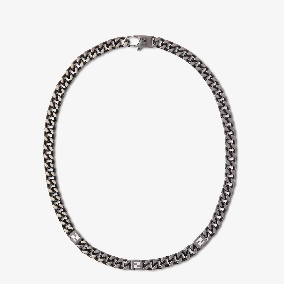 Chain link necklace closed with clip. Made of metal with a ruthenium finish. Decorative FF details with a shiny palladium finish on the inside. Made in Italy Composition: 100% steel Product Code: 7AK017AW2RF1UY6 Product Care: The product you have purchased may be embellished with a precious metal top or varnish and may also feature appliques, gemstones (in various shades of the same color), crystals, plexiglass or resin. The mixture of materials and the special details give this product its unique character. To best maintain the product’s appearance over time, avoid contact with sea water, spa water, lacquers, perfumes, solvents, chemicals and abrasive materials. If necessary, clean with water and a neutral soap and/or polish with a dry microfiber cloth.