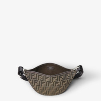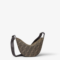 Small Fendi Melon crescent-shaped messenger bag. Made of brown FF jacquard and tone-on-tone full-grain leather. Decorated with FF metal appliqués on the corners. Zipper closure and palladium-finish metalware. Technical fabric adjustable cross-body strap embellished with FENDI lettering. Made in Italy Composition: 100% calf leather, 27% polyester, 27% polyamide, 27% polyurethane, 15% cotton, 4% resin, inside: 90% polyester, 10% polyurethane Product Code: 7VA635ASIQF19KW