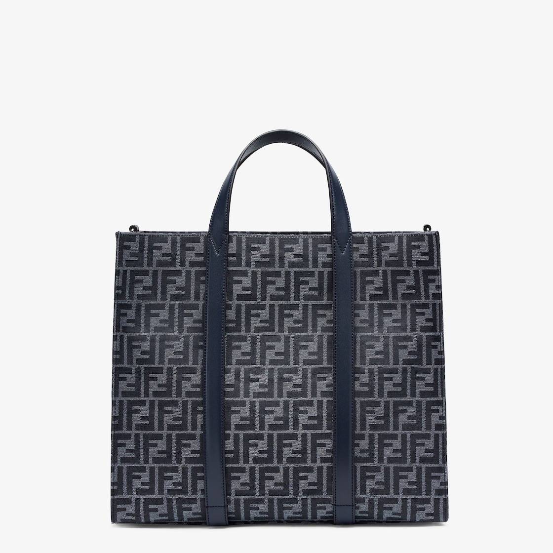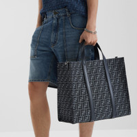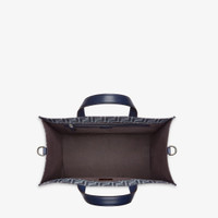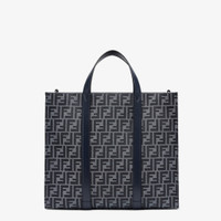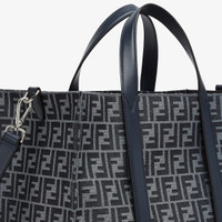Spacious shopper made of jeans blue-colored FF jacquard. Features a lined internal compartment, zipper pocket and palladium-finish metalware. Can be carried by hand or on the shoulder thanks to the two dark blue leather handles and the adjustable, detachable shoulder strap. Made in Italy Measurements: - Height : 35 cm - Depth : 19 cm - Width : 41 cm - Weight : 1.2 kg Composition: 62% polyester, 33% cotton, 5% resin, 100% calfskin, inside: 63% cotton, 34% polyester, 3% acrylic Product Code: 7VA390AG0MF1O97