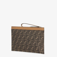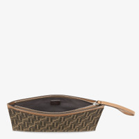 Medium-sized flat pouch with zipper. Made of brown and tobacco jacquard FF motif fabric. Silver-colored Fendi Roma lettering on beige leather and embellished with bracelet handle. Palladium-finish metalware. Made in Italy Composition: 67% polyester, 14% cotton, 12% resin, 7% elastane, 100% calf leather, inside: 63% cotton, 34% polyester, 3% acrylic Product Code: 7N0134AFBVF1HRM