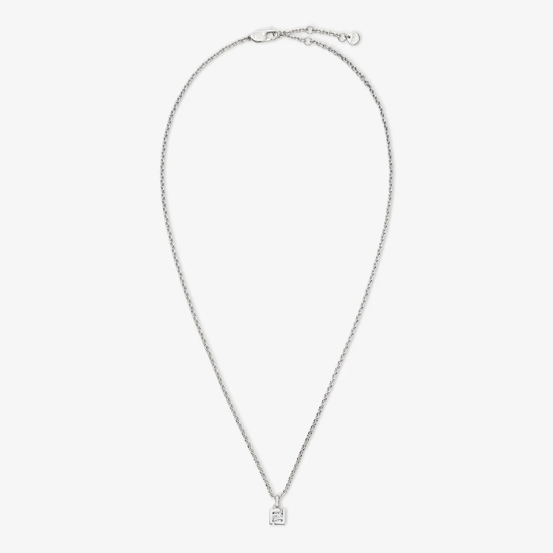 Fine chain-link necklace with FF pendant. Decorated with white crystal set in the double F. Made of palladium-finish metal. Made in Italy Composition: 100% brass, 100% cubic zirconia Product Code: 7AJ873A44GF035M Product Care: The product you have purchased may be embellished with a precious metal top or varnish and may also feature appliques, gemstones (in various shades of the same color), crystals, plexiglass or resin. The mixture of materials and the special details give this product its unique character. To best maintain the product’s appearance over time, avoid contact with sea water, spa water, lacquers, perfumes, solvents, chemicals and abrasive materials. If necessary, clean with water and a neutral soap and/or polish with a dry microfiber cloth.