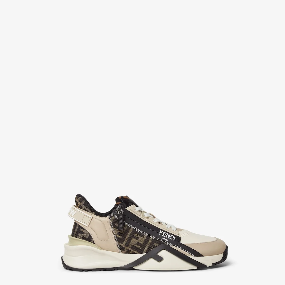 Slip-on sneakers with elastic laces, side zipper and corrugated sole with engraved F. Fendi Flow lettering embossed on the heels. Made of white and beige leather. Brown FF jacquard details. Embellished with Lycra® details with FF motif and contrasting black leather trim. White rubber soles with black diagonal F detail. Made in Italy Composition: 100% calf leather, 65% polyamide, 35% cotton, inside: 100% polyester Product Code: 7E1392AJZHF1OU2