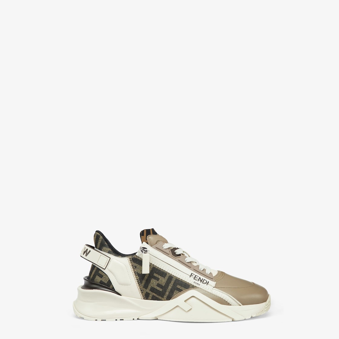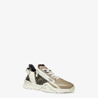Slip-on sneakers with elastic laces, side zipper and corrugated sole with engraved F. Fendi Flow lettering embossed on the heels. Made of beige leather with FF fabric inserts. Embellished with Lycra® details with FF motif. Lightweight white rubber soles with matching diagonal F detail. Made in Italy Composition: 100% calf leather, 65% polyamide, 35% cotton, inside: 100% polyester Product Code: 7E1392AJZHF1MDC