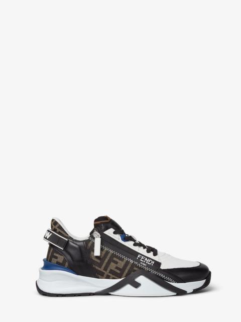Slip-on sneakers with elastic laces, side zipper and corrugated sole with engraved F. Fendi Flow lettering embossed on the heels. Made from black FF jacquard. Details in white and gray leather. Embellished with Lycra® details with FF motif. Lightweight white rubber soles with gray diagonal F detail. Made in Italy Composition: 100% calf leather, 65% polyamide, 35% cotton, inside: 100% polyester Product Code: 7E1392AJZHF1OU1