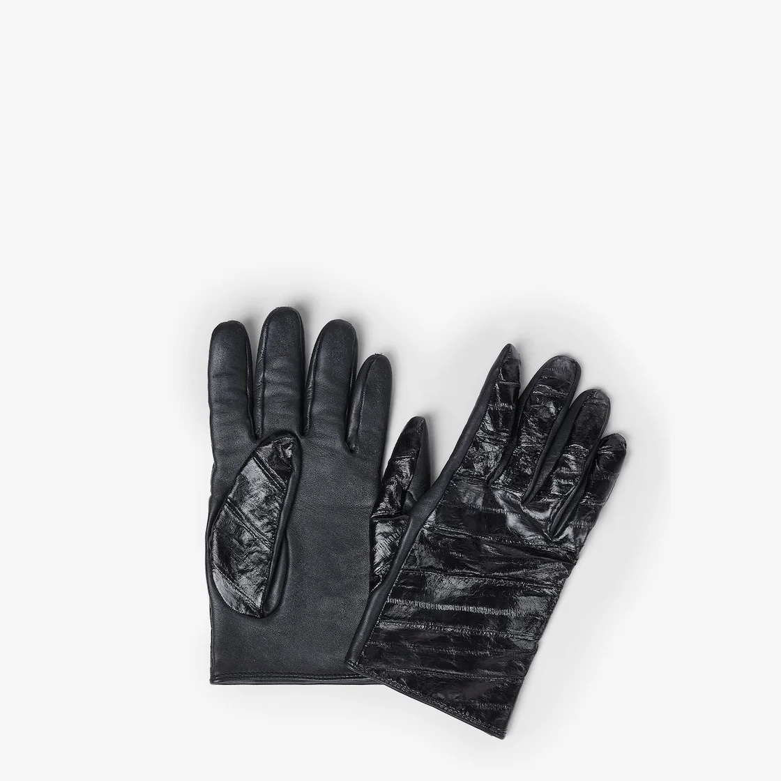 Gloves made of hagfish leather with an inlaid Chevron motif in black tones, inspired by a design from the Fendi archive. Finished with black leather palm and lining in warm cashmere yarn. Made in Italy Composition: 100% hagfish, 100% lamb leather, lining: 100% silk Product Code: FXY592AVG0F0QA1