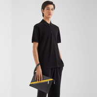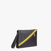 Clutch with removable bracelet handle, internal card holder and diagonal zip pocket on the front. Zip fastening. Made of gray textured fabric with FF motif. Embellished with black leather insert and yellow inlaid detail. Palladium-finish metalware. Made in Italy Composition: 45% Cotton, 40% Polyurethane, 15% Polyester, 100% Calfskin, inside: 61% Cotton, 32% Polyester, 7% Polyurethane Measurements: - Height: 20 cm - Depth: 6 cm - Length: 27 cm - Weight: 0.5 kg Product Code: 7VA491A9XSF0R2A
