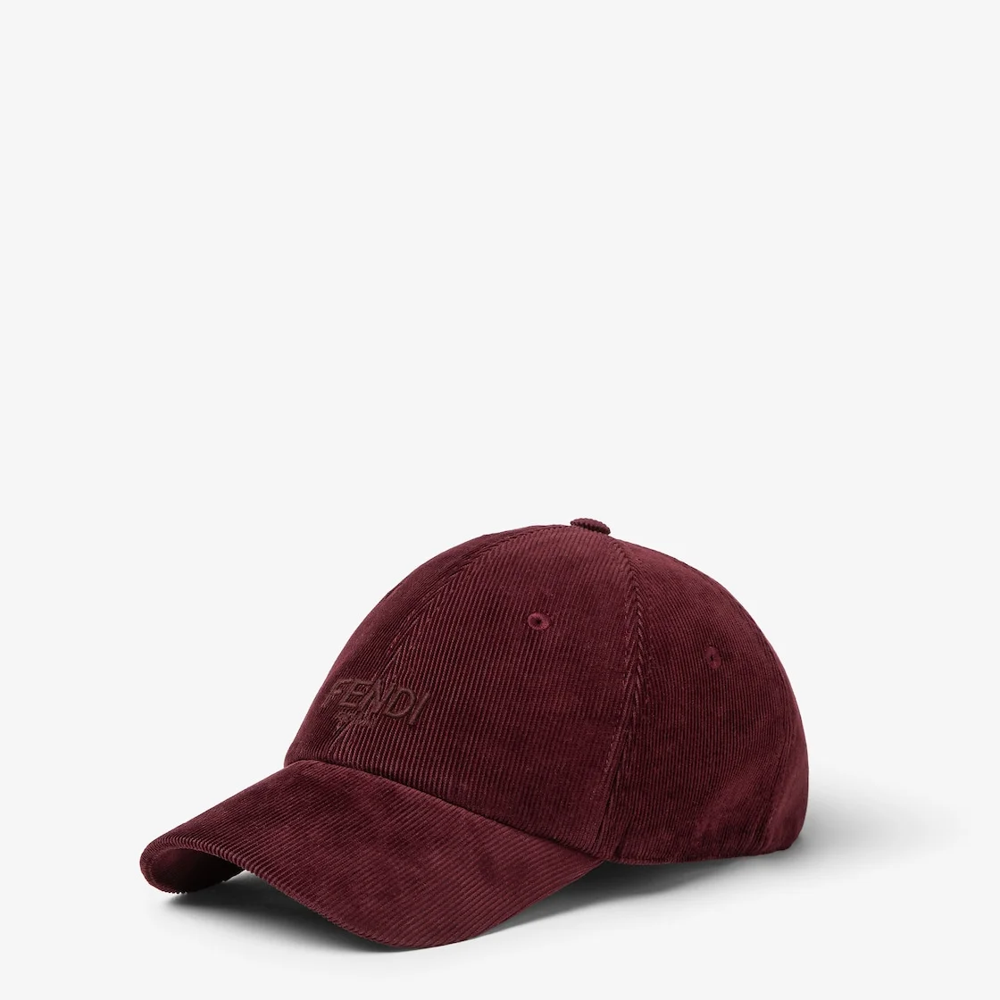 Baseball cap with semi-stiff peak. Velcro closure at the back. Made entirely in burgundy corduroy. Features a matching embroidered FENDI logo on the front. Made in Italy Composition: 100% cotton, lining: 100% cotton Product Code: FXQ133AVPLF0TX1