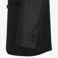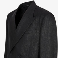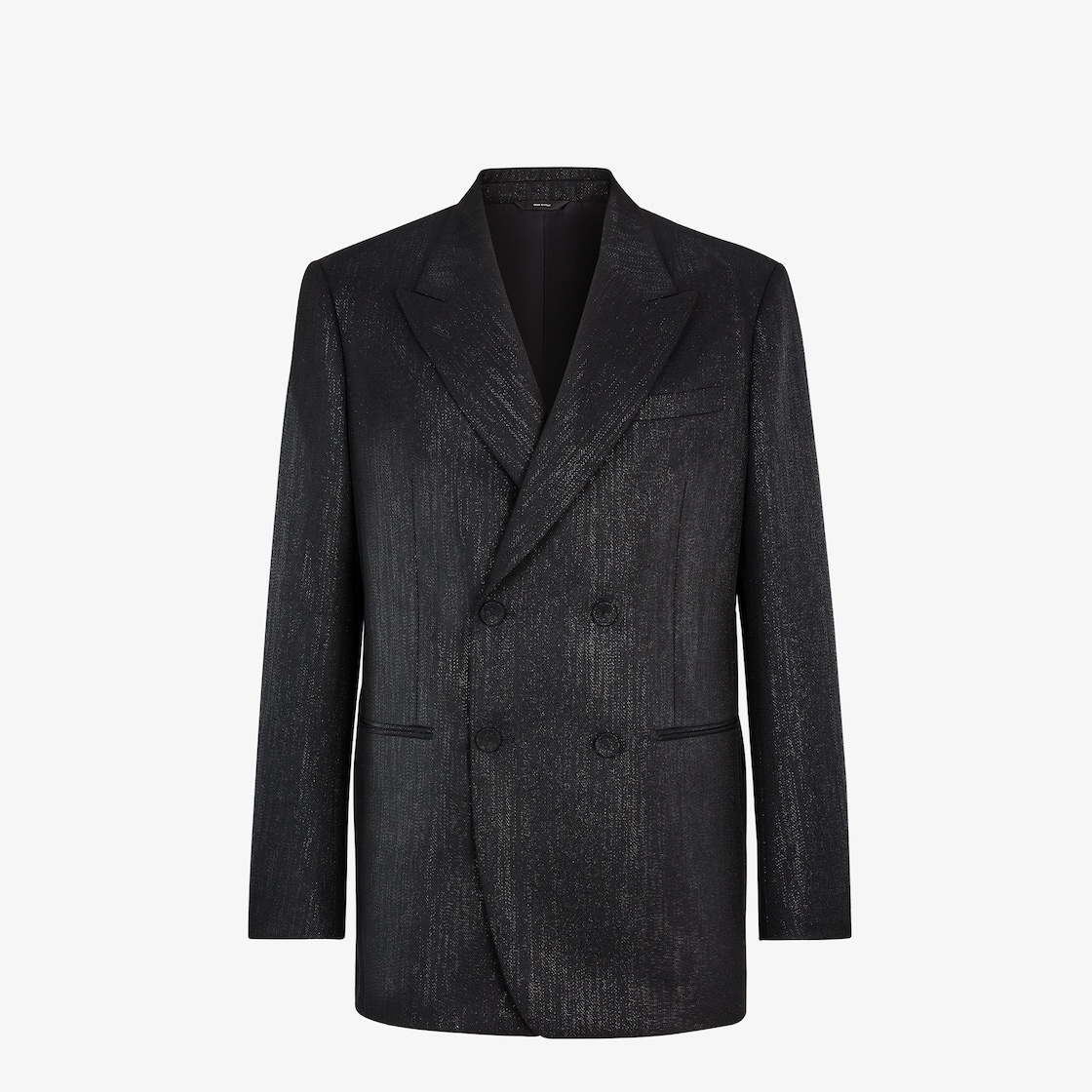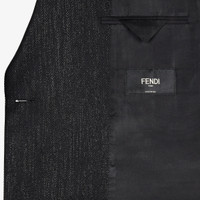 Boxy-fit, double-breasted blazer. Lined, with peak lapels, breast pocket and double welt side pockets. Center slit at the back. Button closure. Made of black Fendi Sparkle gabardine. Lurex thread adds shine and starry reflections to the texture. Made in Italy Composition: 70% fleece wool, 25% viscose, 3% polyester, 2% polyamide, lining: 100% cupro Size worn: 48 IT. The model is 188 cm tall Product Code: FJ0733ASCCF0QA1