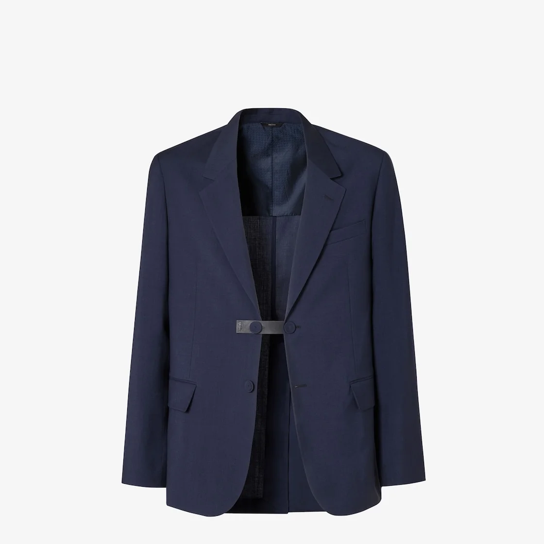 Single-breasted blazer with central vent at the back. Lapels, breast pocket and welt pockets with flap on the front. Closure with covered buttons. Made of dark blue wool canvas. The garment has a removable black leather strap with metal Fendi detail and buttonholes to alter the fit and define the volume of the silhouette. Embellished with FF Selleria embroidery on the sleeve. Semi-lined in matching micro FF cupro. Made in Italy Composition: 100% fleece wool, lining sleeves: 100% cupro Product Code: FJ0987AYU7F0QG0