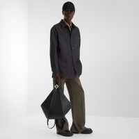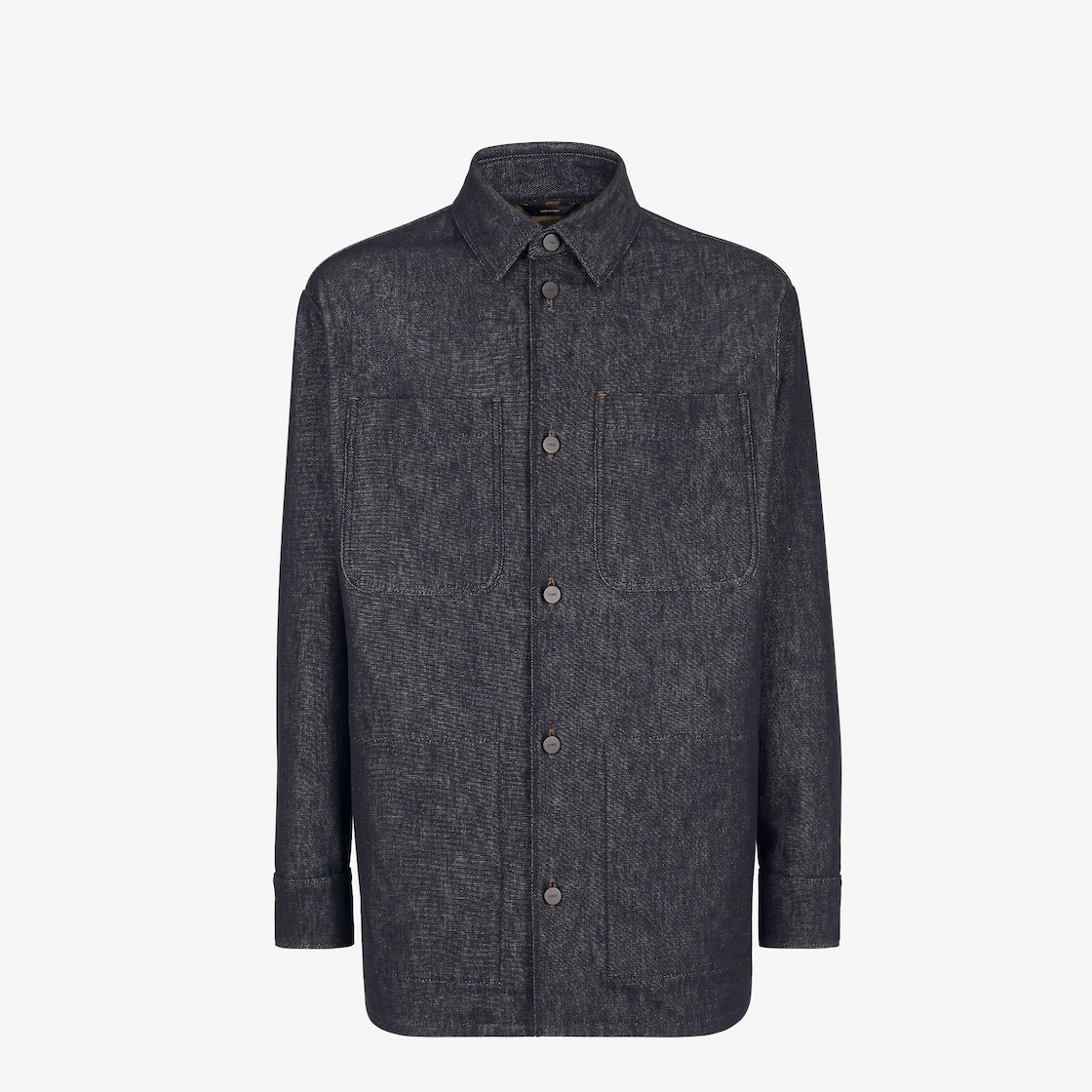 Straight, long-sleeved oversized jacket. Collar and shirt cuffs. Side pockets and large patch pockets on the chest. Closed with logo buttons. Made of dark blue jeans fabric. Deerskin print black leather Fendi patch with Selleria stitching on the back of the collar. Embellished with FF canvas internal details and black satin-finish buttons. Made in Italy Composition: 100% cotton, 65% polyester, 35% cotton Size worn: 48 IT. The model is 188 cm tall Product Code: FW1331ASD0F0RBB