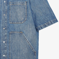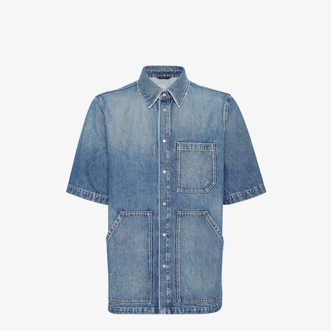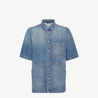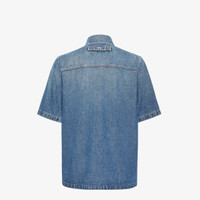 Short-sleeved overshirt. Patch pocket on the chest and oversize patch pockets on the front. Metal logo snap button closure. Made of blue jeans fabric. Customized with Fendi lettering on the pocket and a metal FF applique at the back of the neck. Finished with contrasting stitching. Made in Italy Composition: 100% cotton, 65% polyester, 35% cotton Size worn: 48 IT. The model is 186 cm tall Product Code: FW1315AS02F0RBB