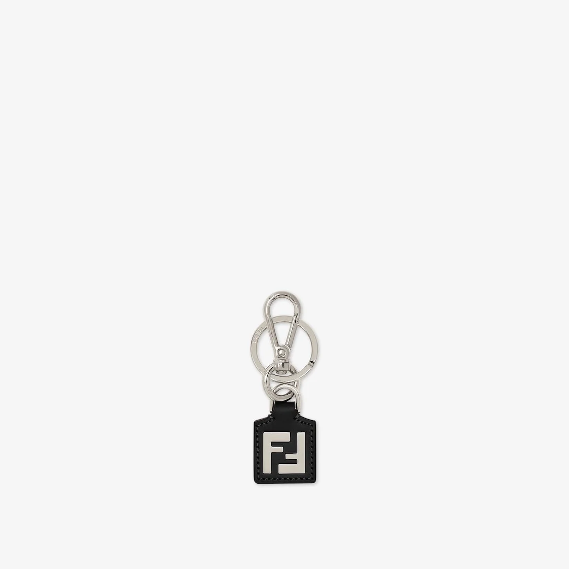 Geometric key ring with clip and logo ring. Made of black leather and part of the collection curated with designer Stefano Pilati. Back in brown and tobacco FF jacquard fabric. Palladium-finish metalware. Made in Italy Composition: 100% calf leather, 100% metal Product Code: 7AP078AFF2F0GXN