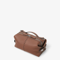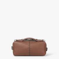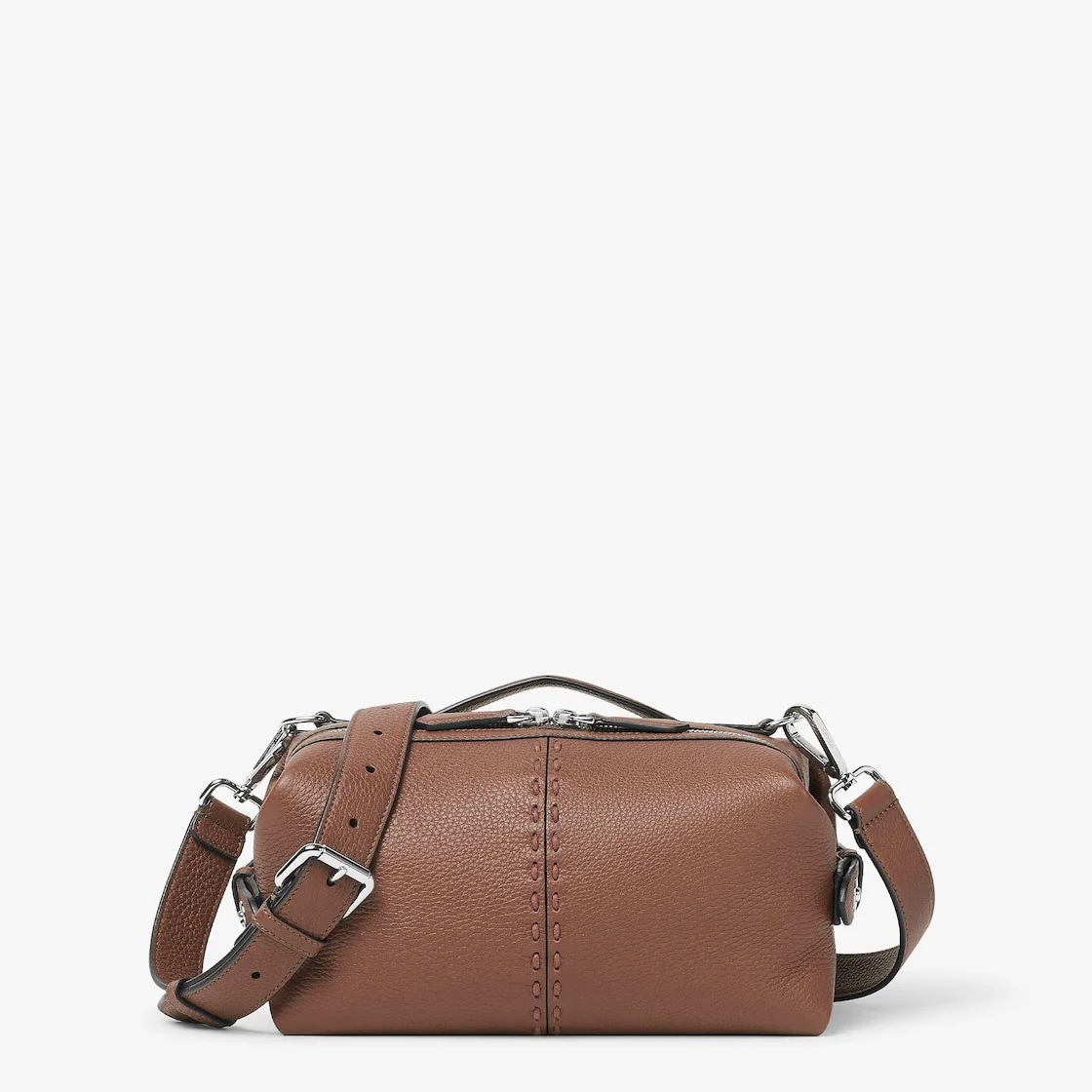 Small Fendi Siesta bag with pliable design, with snap buttons that transform the Boston bag shape into a soft pillow-inspired design. Made of brown Cuoio Romano leather, embellished with 266 hand-sewn tone-on-tone Selleria stitches. Closed with double slider zipper, lined interior zipper pocket and Fendi Selleria numbered silver tag sewn on by hand. Palladium-finish metalware. Can be carried by hand or on the shoulder thanks to the off-center handle and adjustable, detachable leather shoulder strap. Made in Italy Composition: 100% calf leather, inside: 90% polyester, 10% polyurethane Product Code: 7VA639ARLZF1SCH