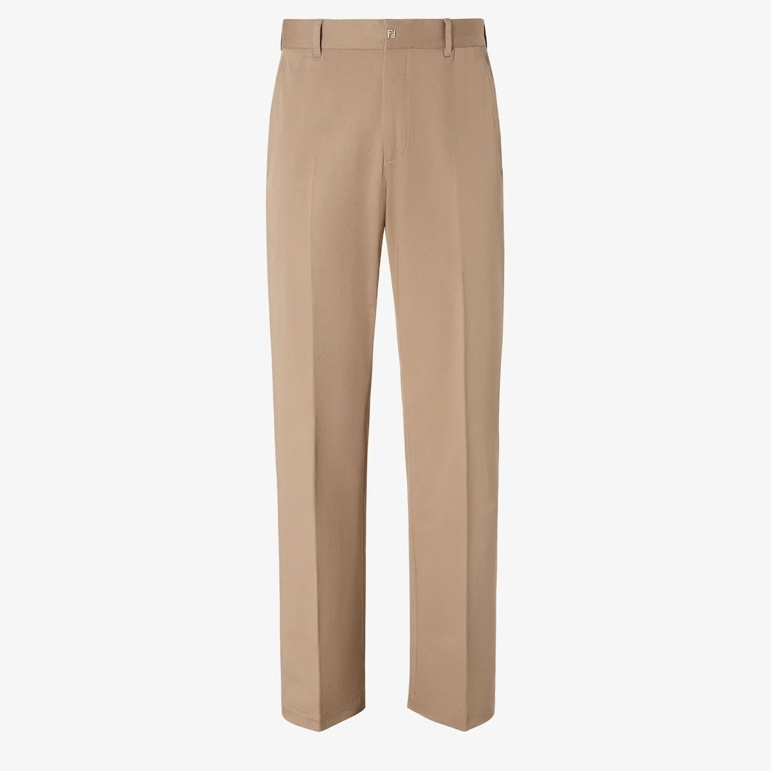 Cigarette pants with side pockets. Belt loops on the waistband and trouser crease. Concealed zipper and hook closure. Made of dove gray stretch gabardine. Customized with a button-effect palladium-finish metal micro FF logo applied at the waist. Made in Italy Composition: 97% cotton, 3% elastane, lining: 65% polyester, 35% cotton, 1 button: mother-of-pearl Size worn: 48 IT. The model is 186 cm tall Product Code: FB1076AQMVF0QD3