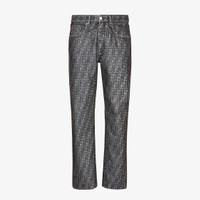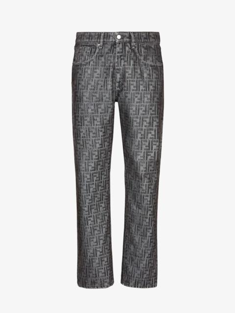 Straight-cut five-pocket pants. Embellished with customized rivets and buttons. Concealed zipper closure. Width at the hem: 19.5 cm (7.8 inches). Finished with dark gray jeans fabric with flocked FF. Embellished with metal logo rivets. Made in Italy Composition: 66% cotton, 34% polyester Size worn: 48 IT. The model is 188 cm tall Product Code: FLP288APSWF1LUY