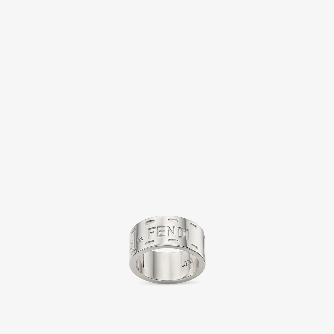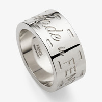 Wide band ring made of palladium-finish metal. Embellished with Made in Fendi lettering and engraving echoing Selleria stitching. Made in Italy Composition: 100% brass Product Code: 7AJ817B08F0TH0 Product Care: The product you have purchased may be embellished with a precious metal top or varnish and may also feature appliques, gemstones (in various shades of the same color), crystals, plexiglass or resin. The mixture of materials and the special details give this product its unique character. To best maintain the product’s appearance over time, avoid contact with sea water, spa water, lacquers, perfumes, solvents, chemicals and abrasive materials. If necessary, clean with water and a neutral soap and/or polish with a dry microfiber cloth.
