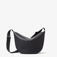 Medium Fendi Melon crescent-shaped messenger bag. Made of black full-grain leather. Decorated with FF metal appliques on the corners. Zipper closure and palladium-finish metalware. Technical fabric adjustable cross-body strap embellished with FENDI lettering. Made in Italy Composition: 100% calf leather, inside: 90% polyester, 10% polyurethane Product Code: 7VA663ASIHF0GXN