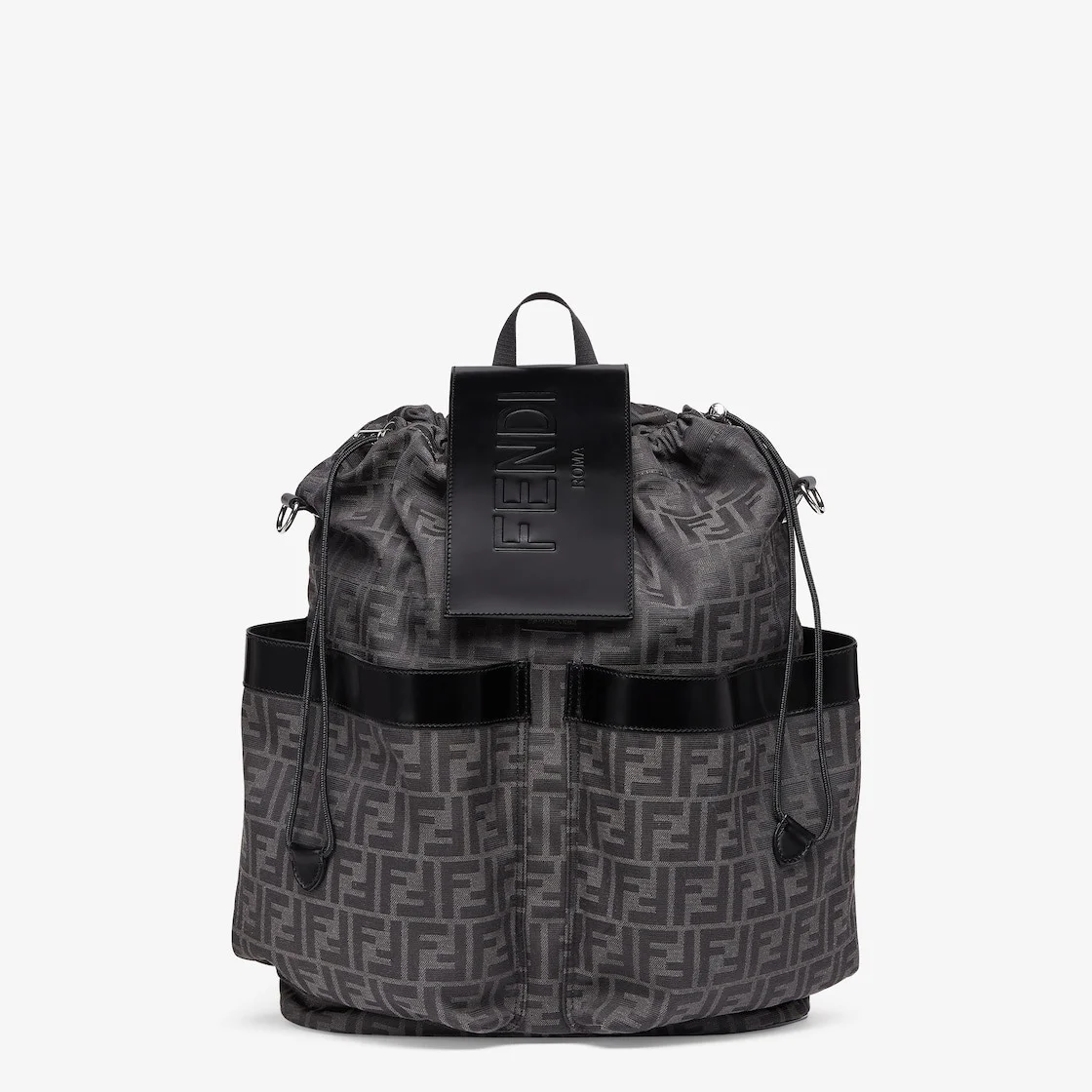 Large backpack in jacquard fabric with a black and gray FF motif. Black leather details and flap with embossed Fendi Roma logo. Features two front pockets, drawstring closure, inner zipper pocket and palladium-finish metalware. It can be worn over the shoulder or held by hand thanks to the additional detachable strap. Made in Italy Measurements: - Height : 46 cm - Depth : 25 cm - Width : 40 cm - Weight : 1.2 kg Composition: 100% polyamide, 100% calf leather, 100% polyester, inside: 94% polyamide, 6% acrylic Product Code: 7VZ056AG0MF0NPN