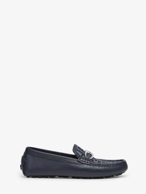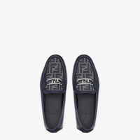 Driving loafers. Flexible pebble soles. Made of blue full-grain leather with a jeans blue-colored FF jacquard apron. Embellished with a metal Fendi O'Lock buckle with a palladium finish. Made in Italy Composition: 100% calf leather, 65% polyamide, 35% cotton, 100% resin, lining: 100% calf leather Product Code: 7D1561AQZBF1OOD