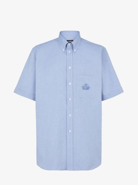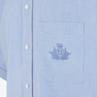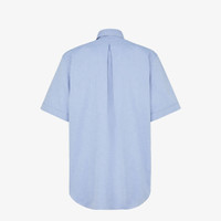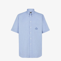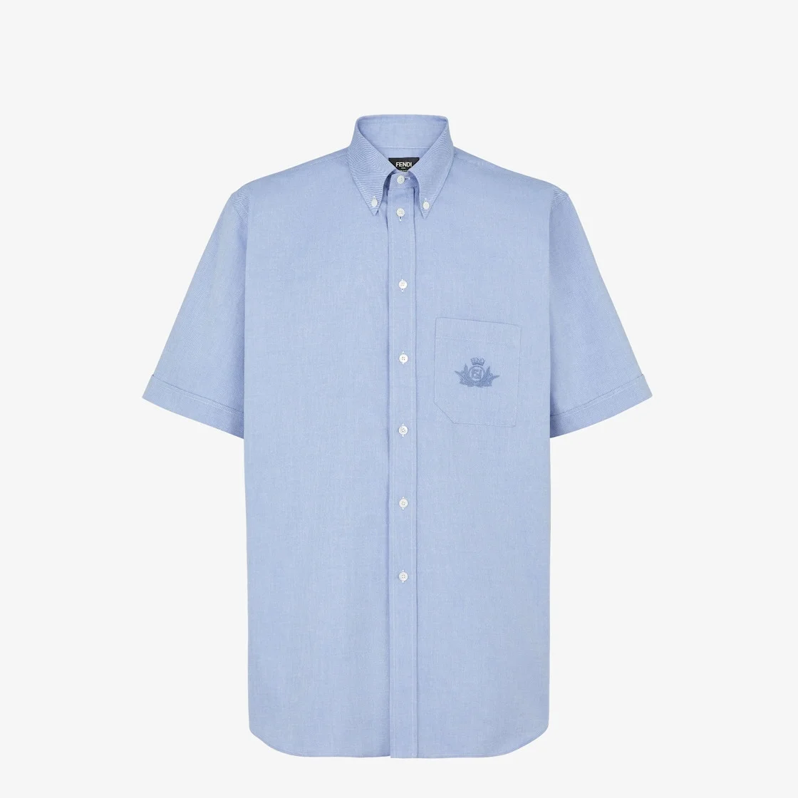 Shirt with button-down collar and short sleeves. Breast pocket and reverse pleat on the back. Visible button closure. Made of light blue cotton Oxford. The Fendi Crest, embroidered and applied on the breast pocket, is the Fendi Club emblem designed by Silvia Venturini Fendi to celebrate the brand’s centennial. An exclusive symbol of a family tradition that has redefined the concept of elegance and sport. Made in Italy Composition: 100% cotton, 12 buttons: mother of pearl Size worn: 48 IT. The model is 186 cm tall Product Code: FS1312AU70F1QBO