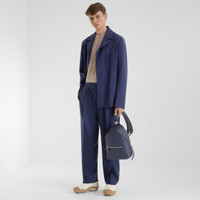 pants with elasticated waist and darts at the front. Trouser crease on the leg. Side pockets and patch pockets on the back. Concealed zipper closure. Width at the hem: 22 cm. Made of blue natural dyed wool fabric. Embellished with Made in Fendi label sewn on the back. Made in Italy Composition: 100% fleece wool, lining: 100% viscose, buttons: 100% hemp, 2 buttons: 100% mother of pearl Size worn: 48 IT. The model is 187 cm tall Product Code: FB0979AR8SF04V6