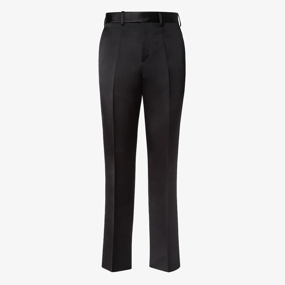 Pants with flare at the ankle. Belt loops on the waistband and trouser crease. Concealed zipper and hook closure. Made of black duchess silk. Made in Italy Composition: 100% silk, lining: 100% viscose, 1 button: mother-of-pearl Size worn: 48 IT. The model is 188 cm tall Product Code: FB1079A9DGF0QA1