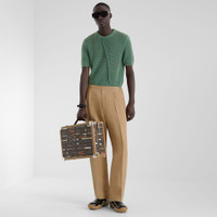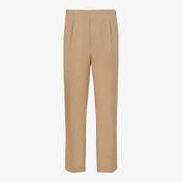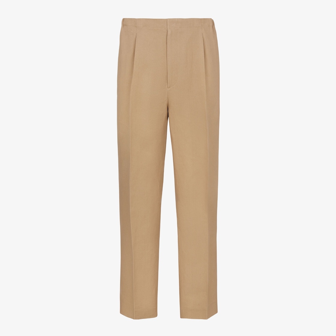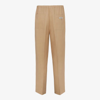 pants with elasticated waist and darts at the front. Trouser crease on the leg. Side pockets and patch pockets on the back. Concealed zipper closure. Width at the hem: 22 cm. Made of beige canvas. Finished with Made in Fendi label sewn on the back pocket. Made in Italy Composition: 100% industrial paper, lining: 100% viscose, secondary lining: 100% cotton, buttons: 100% hemp, 2 buttons: 100% mother of pearl Size worn: 48 IT. The model is 188 cm tall Product Code: FB0979AR96F1MTK