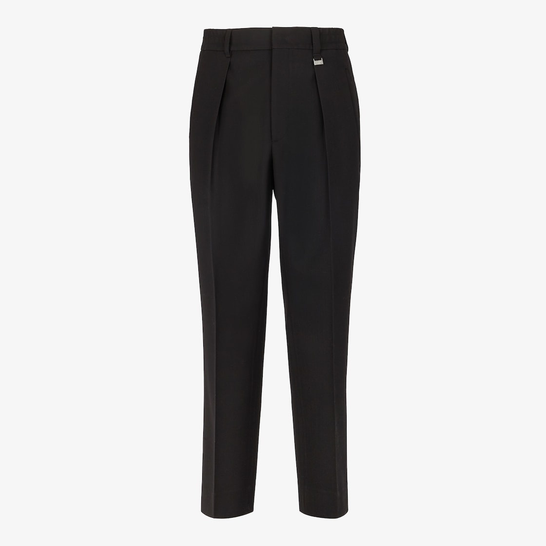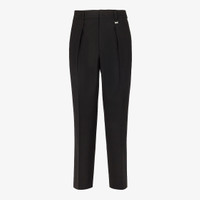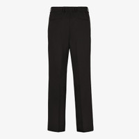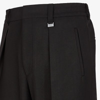 Straight-cut pants with pleats at the front and elastic inserts at the waist sides. Welt side pockets. Concealed zipper closure. Made with black wool crêpe. Metal plaque on the belt loop. Made in Italy Composition: 55% polyester, 45% fleece wool Size worn: 48 IT. The model is 187 cm tall Product Code: FB0895APNFF0QA1