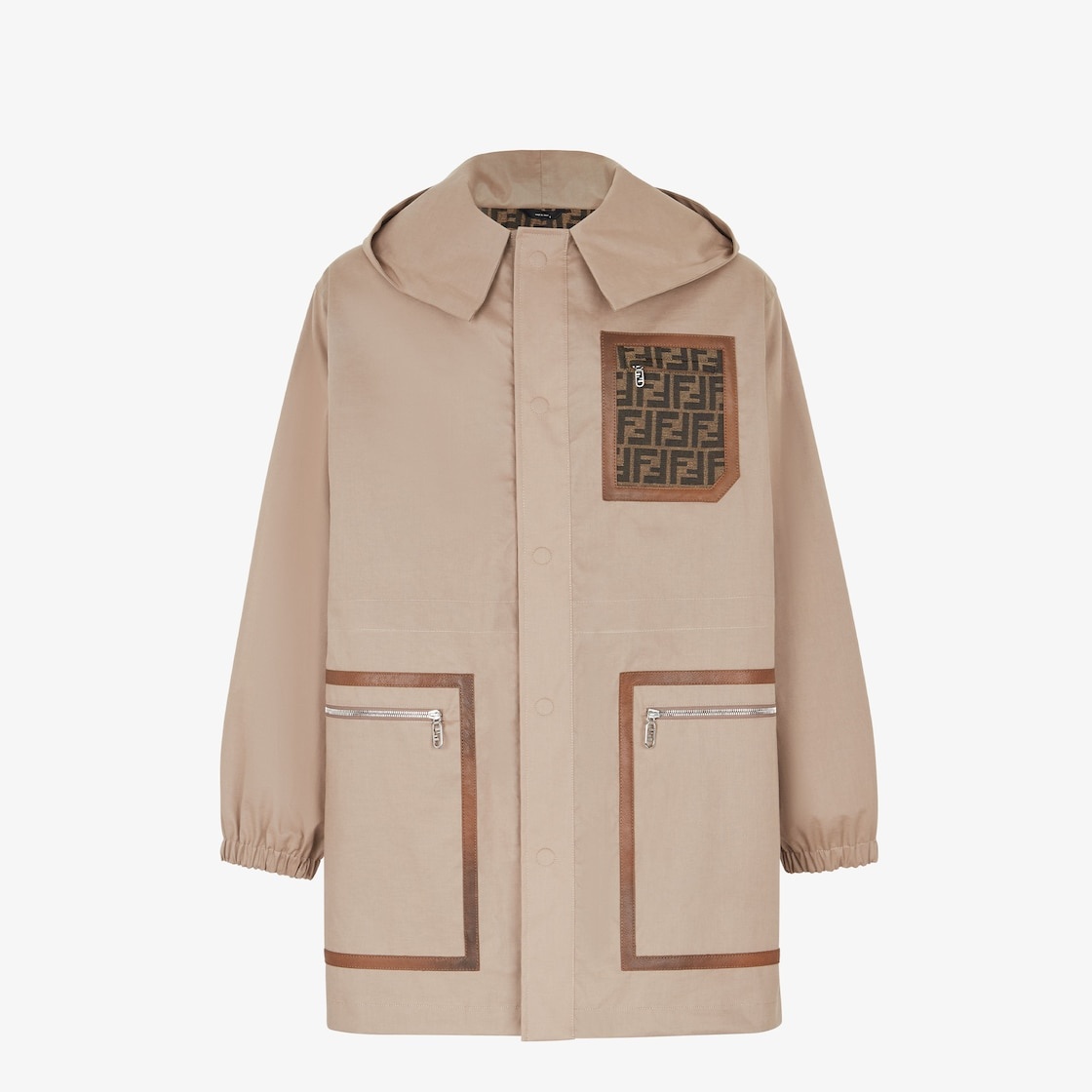 Hooded parka with covered zipper and snap-button closure. Oversized zipper pockets at the front and elasticated cuffs. Small V slit at the back. Made of light brown solid-colored fabric. The pockets are finished with leather trim, the breast pocket with a jacquard FF fabric insert. Lining customized with jacquard FF motif. Made in Italy Composition: 100% co, 100% pu, 65% pl, 35% co, 100% calf leather Size worn: 48 IT. The model is 187 cm tall Product Code: FF0771APNGF1M2L