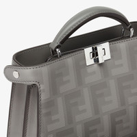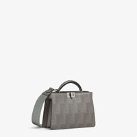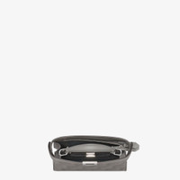 Iconic Peekaboo ISeeU XCross bag made of dove gray Fendi Shadow leather with a striped texture FF motif. The interior is organized into two compartments divided by a stiff partition, the front features the iconic twist lock, and there is a zipper closure on the back. Features a tone on tone leather lining, two compartments separated by a stiff partition, a card slot and palladium-finish metalware. Can be carried by hand or on the shoulder thanks to the handle and adjustable, detachable shoulder strap in webbing with FENDI lettering. Made in Italy Composition: 100% calf leather, interior: 100% calf leather, 90% polyester, 10% polyurethane Model height: null Size worn: null Measurements: - Height : 14.5 cm - Depth : 6 cm - Width : 23 cm Product Code: 7VA582AP1TF1M6H