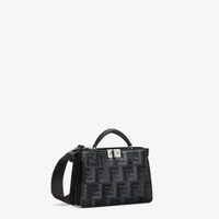 Iconic Peekaboo ISeeU XCross bag made of black Fendi Shadow leather with a striped texture FF motif. The interior is organized into two compartments divided by a stiff partition, the front features the iconic twist lock, and there is a zipper closure on the back. Features a tone on tone leather lining, two compartments separated by a stiff partition, a card slot and palladium-finish metalware. Can be carried by hand or on the shoulder thanks to the handle and adjustable, detachable shoulder strap in webbing with FENDI lettering. Made in Italy Measurements: - Height : 14.5 cm - Depth : 6 cm - Width : 23 cm - Weight : 0.44 kg Composition: 100% calf leather, inside: 100% calf leather, 90% polyester, 10% polyurethane Product Code: 7VA582AP1TF0GXN