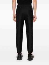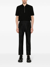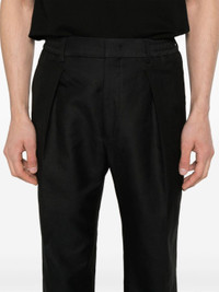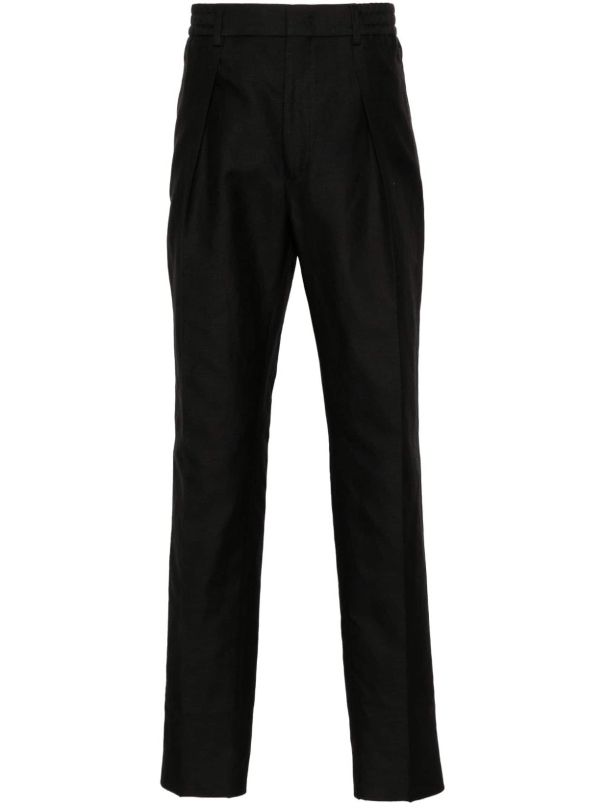 black cotton blend twill weave slub texture pleat detailing pressed crease rear elasticated waistband belt loops two side inset pockets two rear welt pockets concealed front button, hook and zip fastening Size & Fit Model Measurements: Height: 1.85 m Bust/Chest: 91.0 cm Hips: 95.0 cm Waist: 75.0 cm Model wears size 50 Fabric and Care Designer Style ID: FB0767AR9D Designer Colour: F0QA1 BLACK Composition: Polyester 14%, Cotton 59%, Hemp 27% Washing instructions: Dry Clean Only Made in Italy