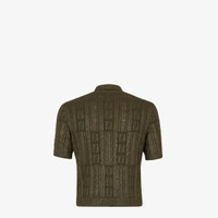 Short-sleeved polo shirt. This style has a classic collar closed with matching-color button. Made of dark green wool yarn. Featuring cable knit with FF details and distinguished by an unusual finish with a low-sheen effect. Rib knit collar and edges. Made in Italy Composition: 100% fleece wool, 1 pcs buttons: mother of pearl Size worn: 48 IT. The model is 188 cm tall Product Code: FZC162ASGOF0GZ4